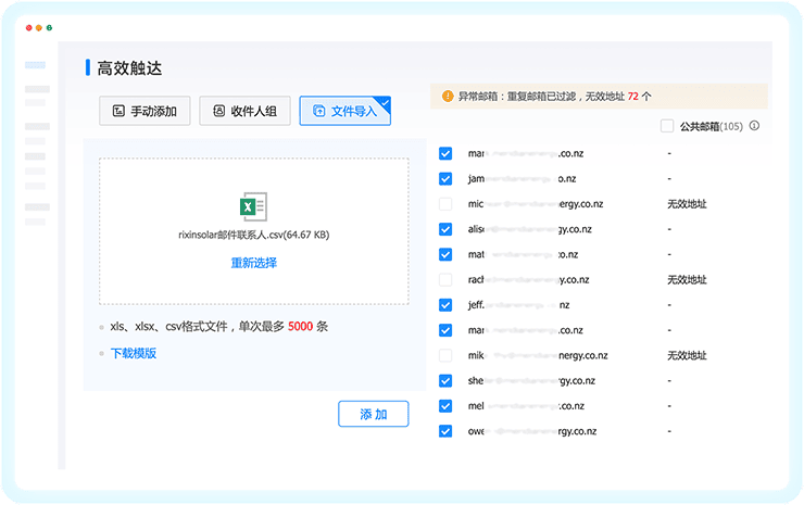 凯发K8外贸通内置自动发送系统,根据需求智能分析投递线路,抵达率达90%以上;联系人管理、重要度匹配、无效邮箱过滤等功能,触达、跟进更高效