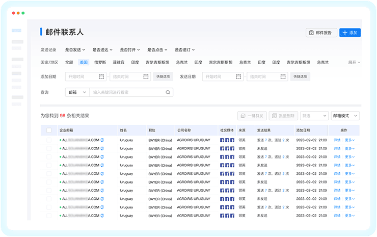 凯发K8外贸通内置自动发送系统,根据需求智能分析投递线路,抵达率达90%以上;联系人管理、重要度匹配、无效邮箱过滤等功能,触达、跟进更高效